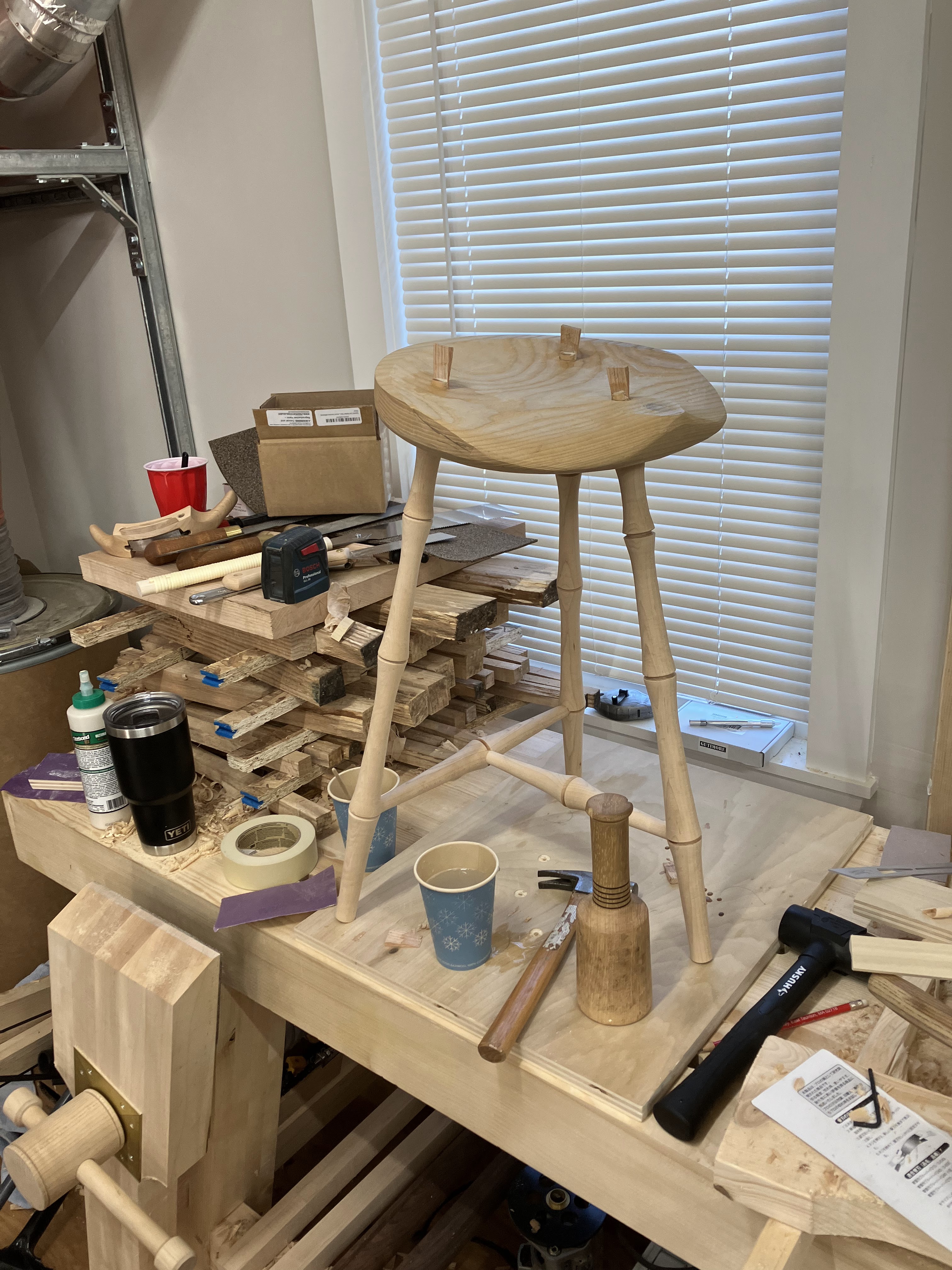 I don’t usually get stressed out during glue-ups, but chairs might be the exception. Since the joints are round, you have to pay careful attention to make sure the orientation is correct before driving the tenon into the mortise. Once these joints are set, they’re not coming apart. In some cases you can’t even adjust them. I did use yellow glue while most chair makers seem to prefer hide glue. After this glue-up I can see the appeal—longer open time and a bit more ‘slip’ in the joint before it sets would have been helpful. My yellow glue joints locked up instantly, making adjustments impossible.