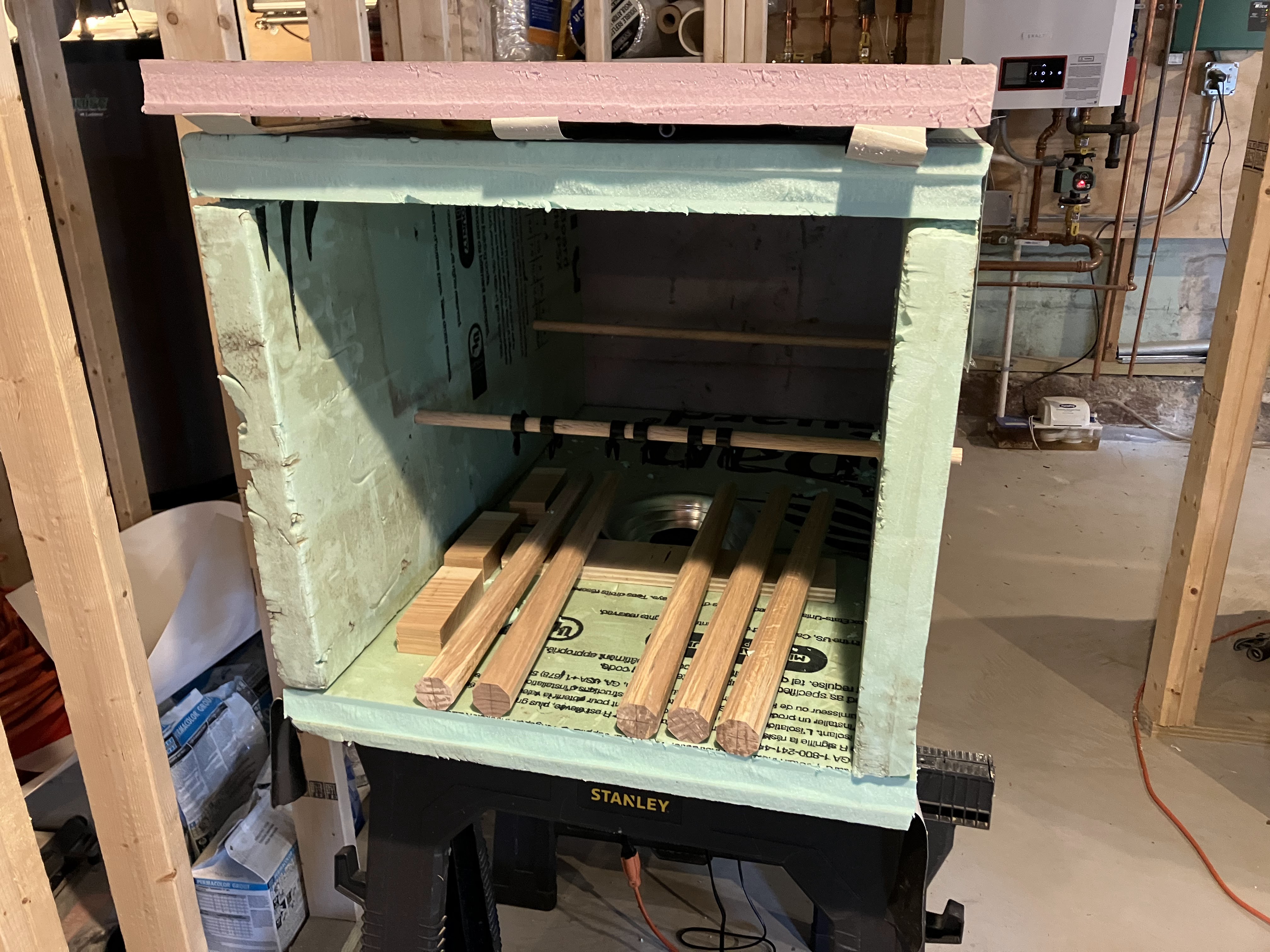 Then it was off to the kiln to dry out the tenons. Currently, my kiln is just some foam boards duct taped together, with a reptile heat lamp inside. There’s a thermostat, but it never quite reaches the setpoint. Someday, I’ll convert a shelf in my utility closet into a more permanent kiln with an adequately sized heating element, but this setup works for now. You’ll also notice that I have a few pieces of hickory off to the left. Those will be used for wedges.