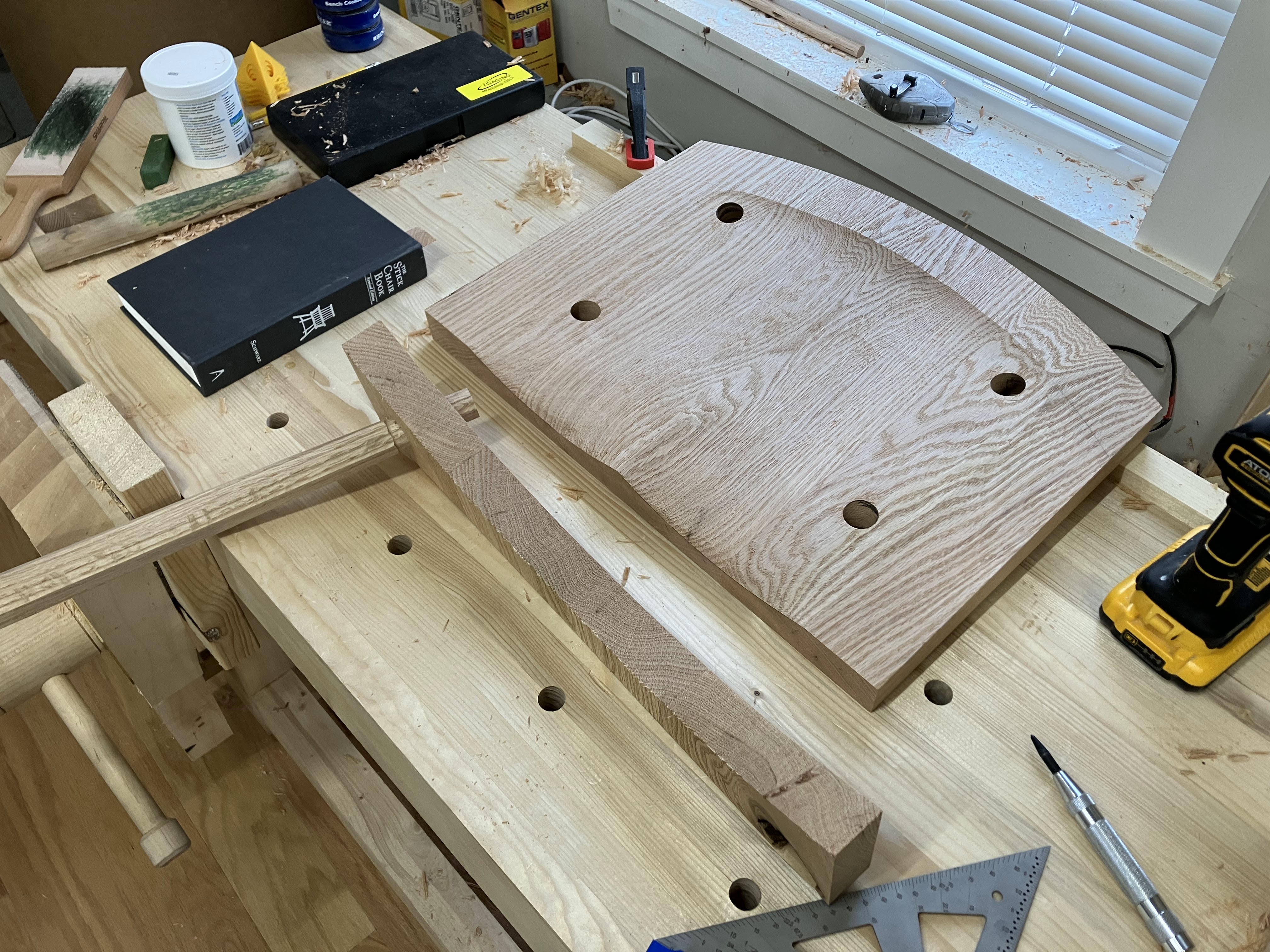 I scooped the seat out before cutting it to its final shape so I could secure it with a holdfast and not worry about surface damage. I was able to get a nice surface with the scorp and a scraper, and I didn’t end up using the travisher much. Since the seat was thin to begin with, I made the bowl fairly shallow—about 1/2″. Once I was done shaping the seat, I sliced the excess off of the back and used the offcut to make a test mortise for the tenons.
