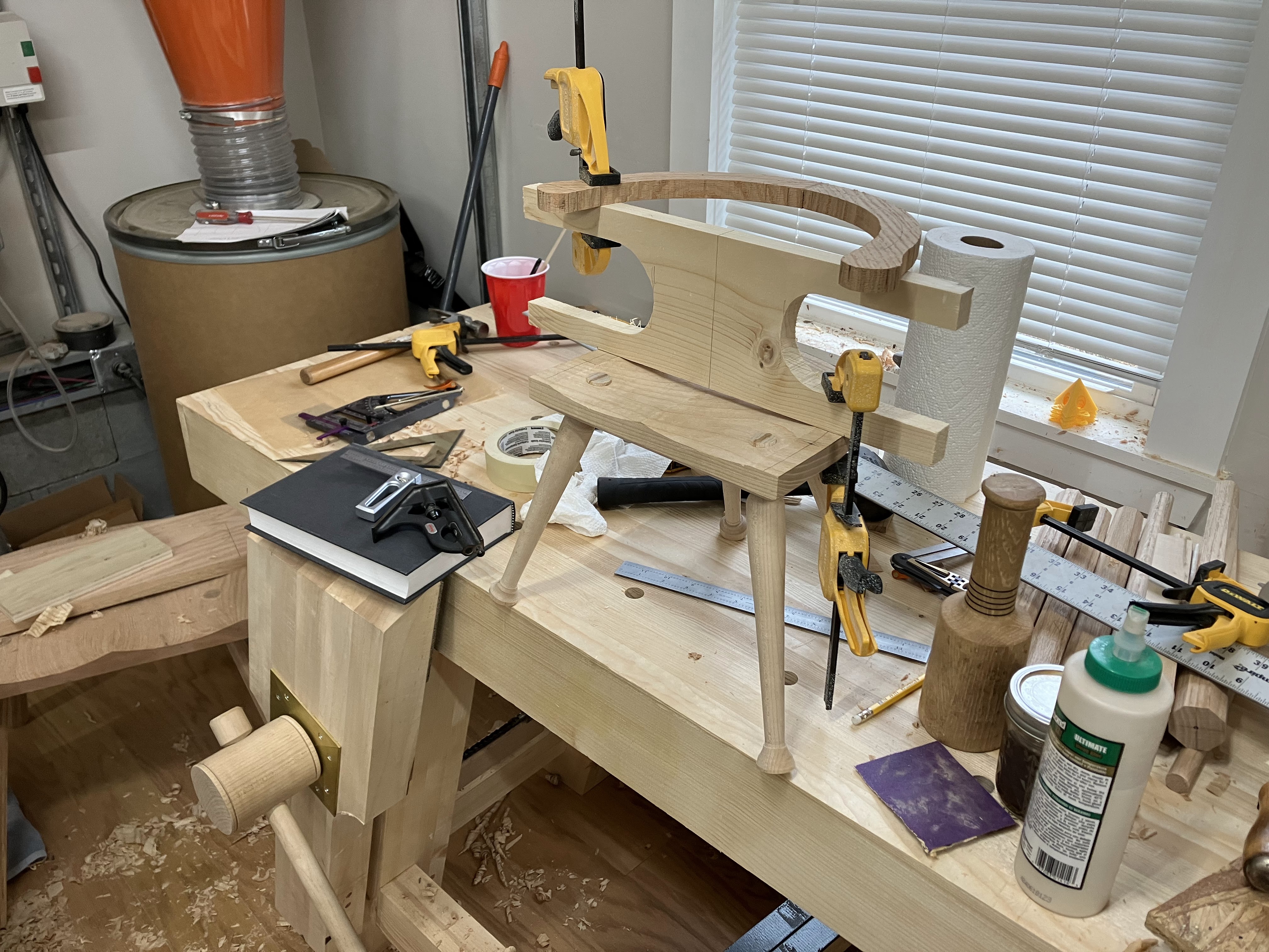 This was my first chair with an upper assembly. I used a jig from The Stick Chair Book to drill the mortises. I think that the chair’s small size made this easier than it would be on a full-sized chair. I used a bevel gauge to help with the angle, but mostly eyeballed the mortises in the armbow. Once those were done, it was straightforward to drill the seat mortises using the holes in the armbow as a guide.