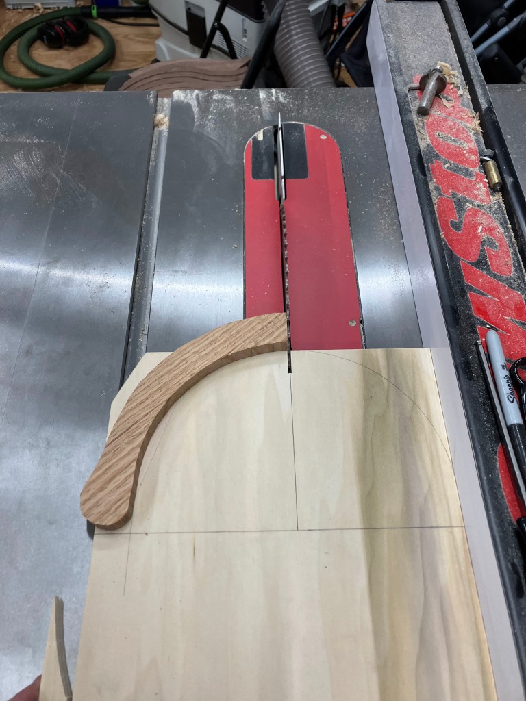 The three-piece armbow is fairly typical. I cut the arms as carefully as I could, but I still needed to “joint” them afterward. The inside of the arms follows the seat’s curve, so I traced the seat on a piece of plywood and used double-sided tape to hold the arms while I jointed them on the tablesaw.
