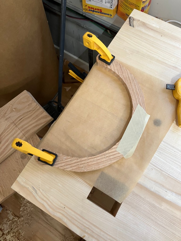 Because of the small size, I didn’t have a great way to apply clamping pressure while gluing. I used a combination of tape and clamps to hold the pieces in place while the glue dried. This isn’t a very critical glue joint, it just needs to survive drilling the mortises. Most of the strength comes from gluing on the third piece of the armbow.