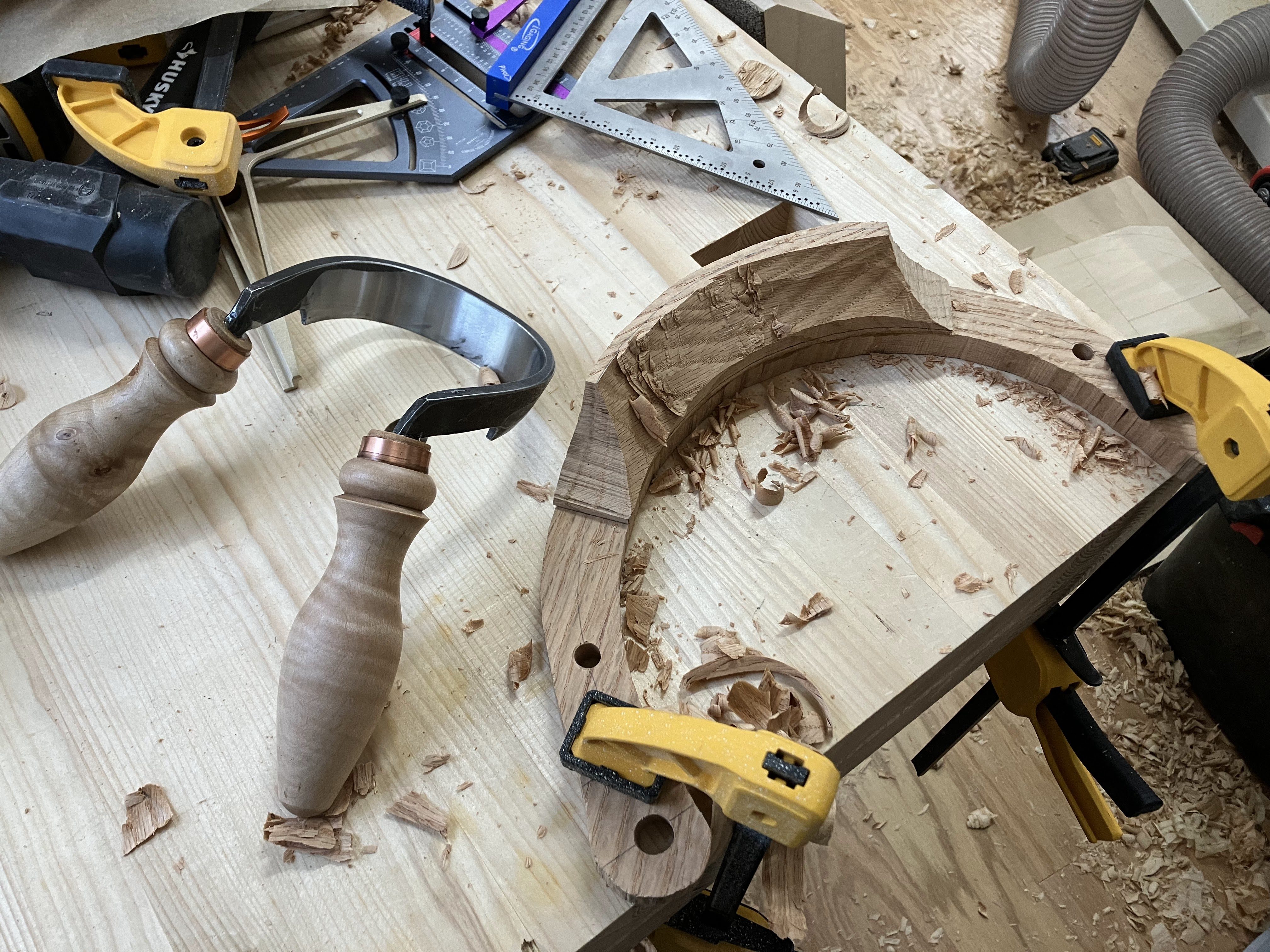 After all the mortises were drilled, I glued on the top piece onto the armbow. I used a scorp to shape the concave section. In the book, Chris uses a bandsaw to rough out the angle, but I thought tilting the table would be more work than just hogging off the material by hand. With the benefit of hindsight, tilting the bandsaw table probably would have been easier. I did get a good workout, though.